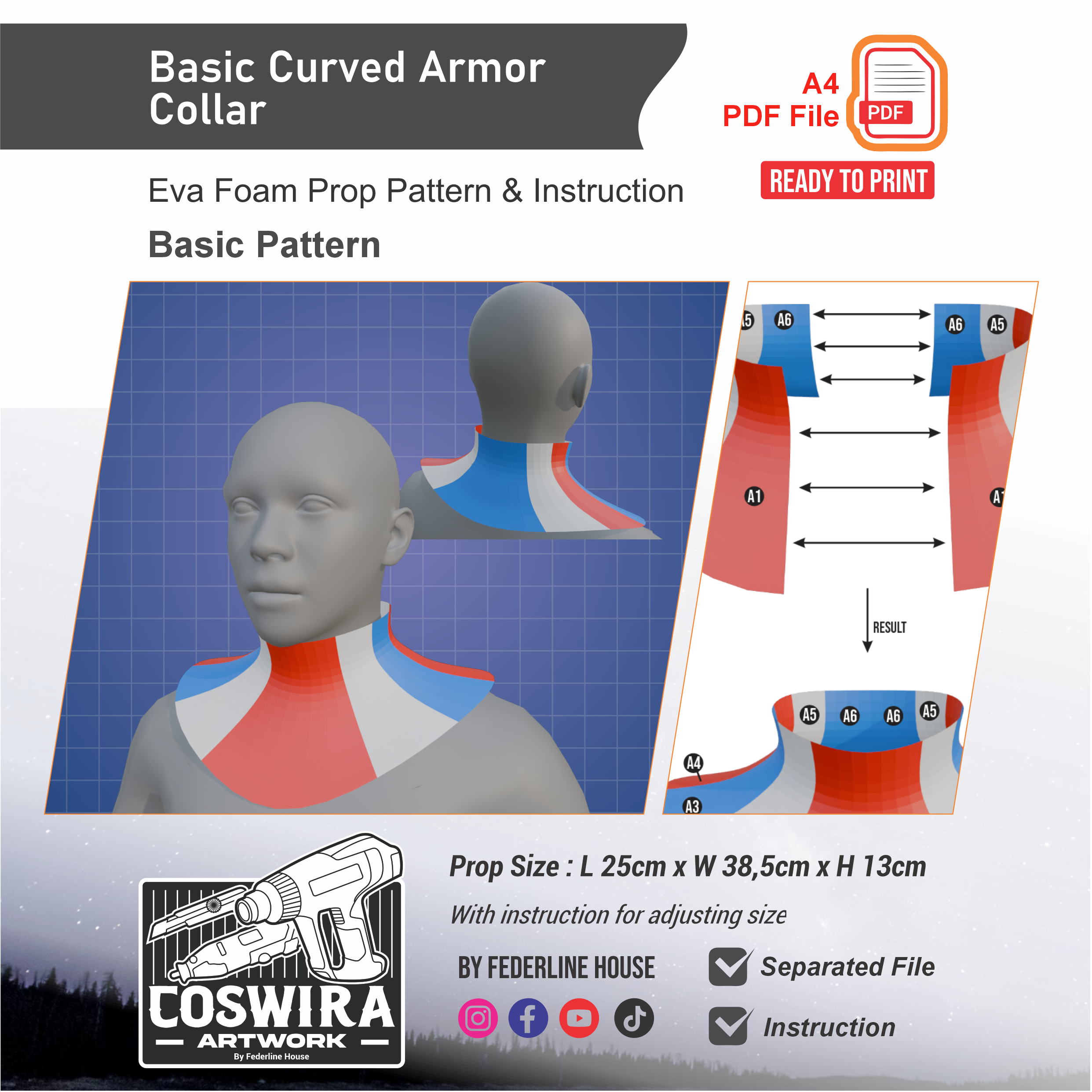 Buat armor collar melengkung dengan EVA Foam basic pattern digital ini, cocok untuk cosplay armor, fantasy costume, atau original character.