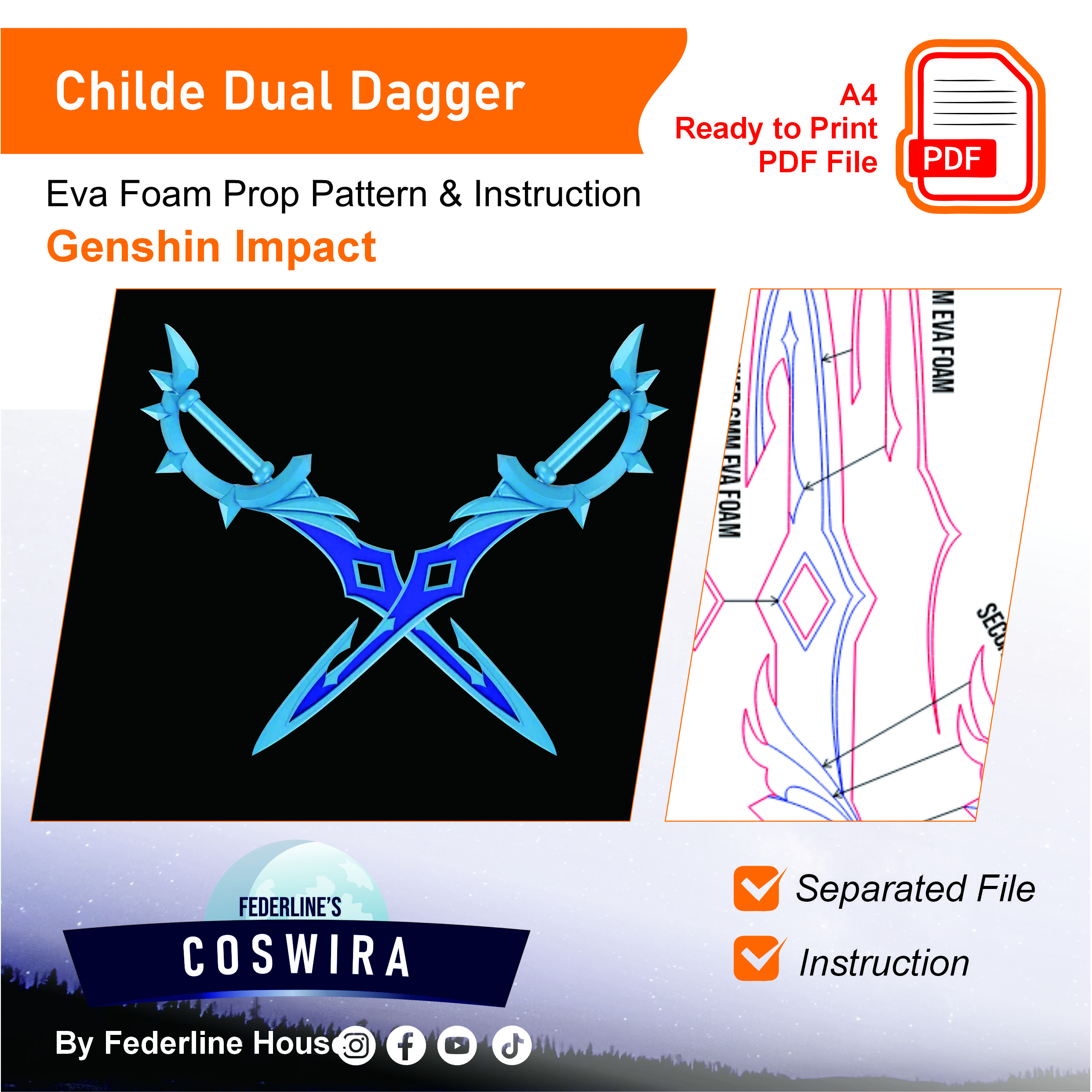 Buat dual dagger milik Childe dari Genshin Impact dengan EVA Foam pattern ini! Template ini dirancang supaya mudah dirakit tapi tetap terlihat tajam, elegan, dan detail seperti senjata versi karakter. Tetap ringan dan nyaman digunakan untuk cosplay event, photoshoot, atau display.