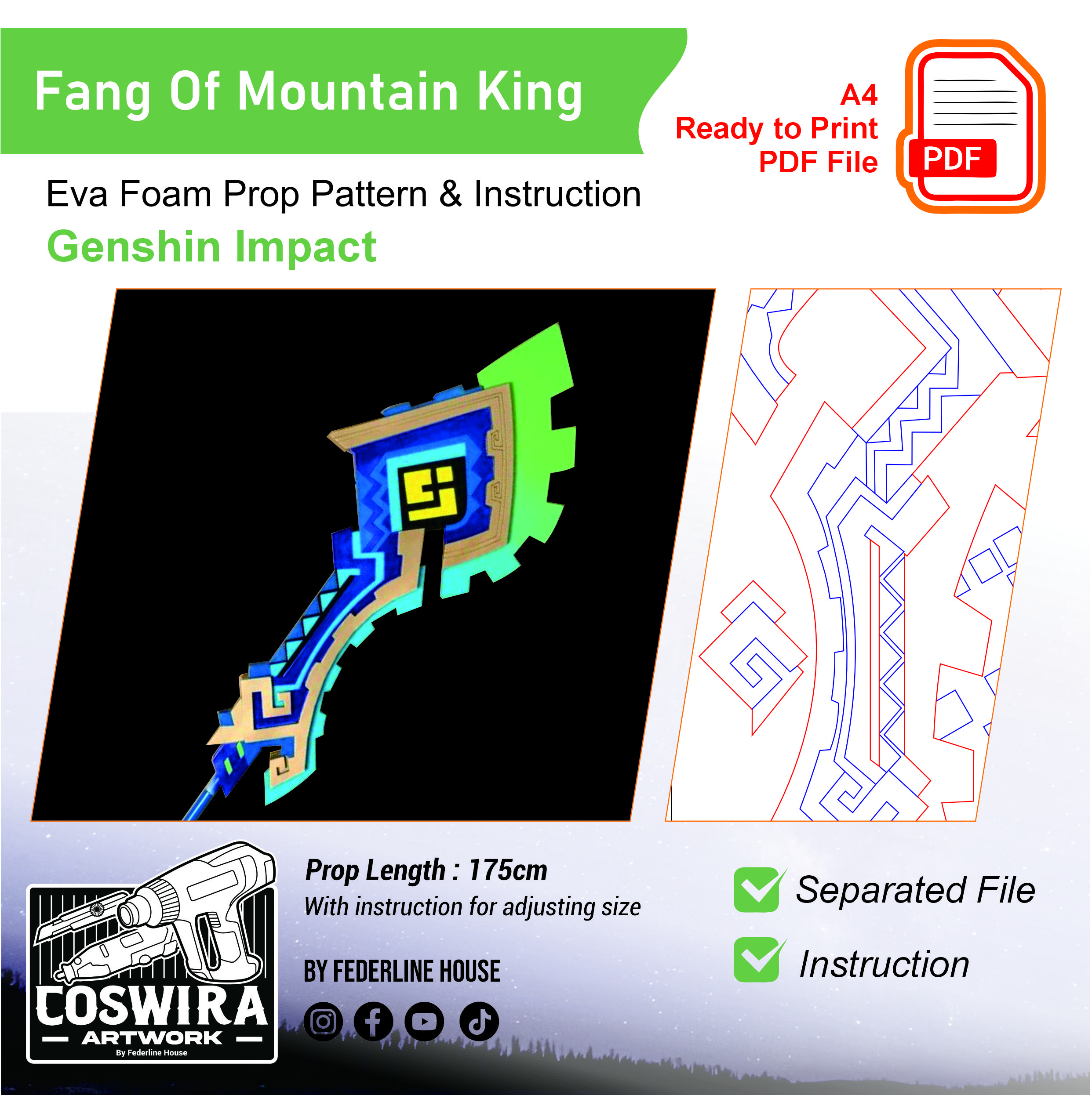 Buat Fang of the Mountain King milik Kinich dari Genshin Impact dengan EVA Foam pattern ini! Template ini dirancang supaya mudah dirakit tapi tetap terlihat besar, kokoh, dan detail seperti senjata versi karakter. Tetap ringan dan nyaman digunakan untuk cosplay event, photoshoot, atau display.
