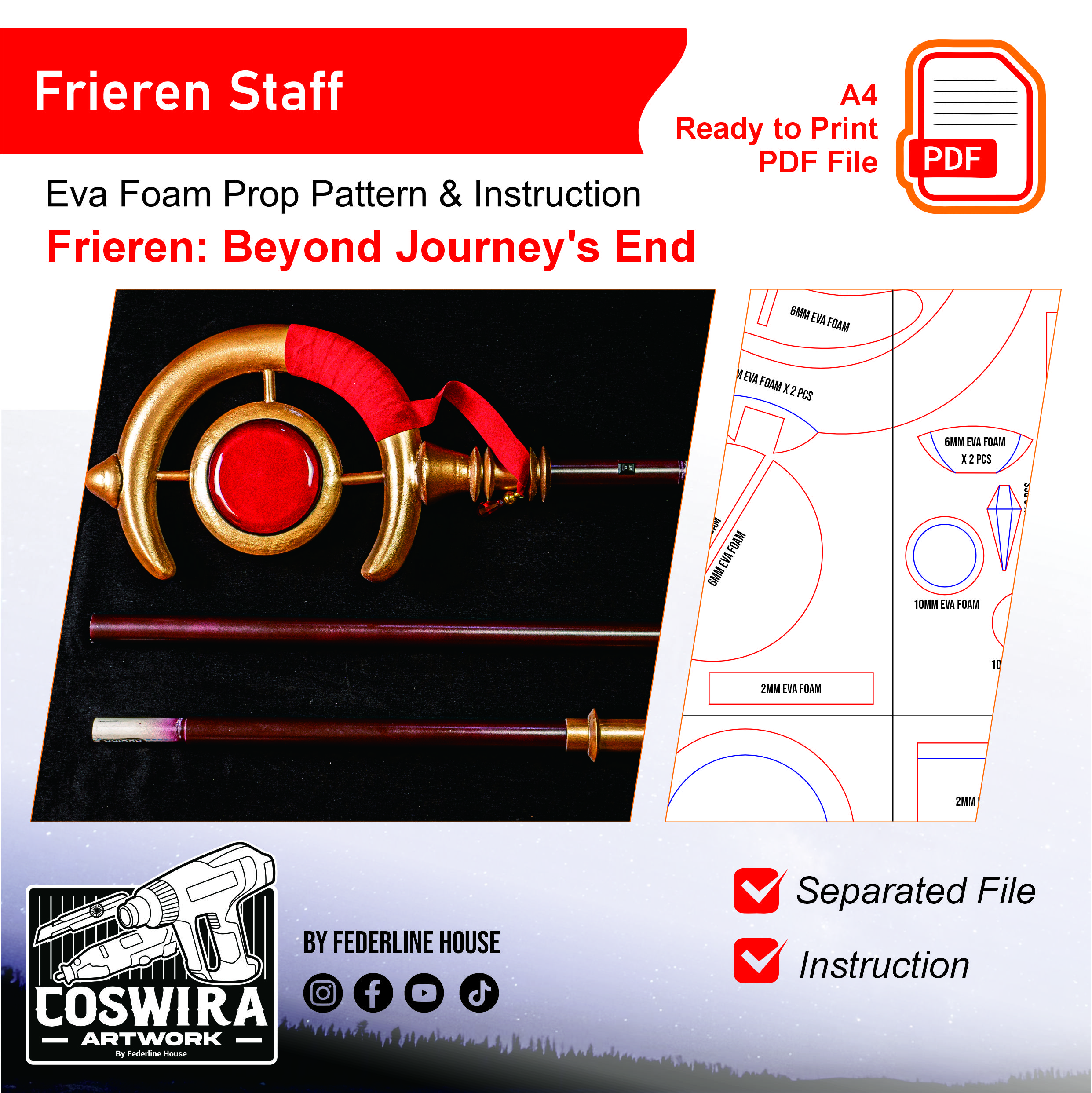 Buat staff milik Frieren dari Sousou no Frieren dengan EVA Foam pattern ini! Template ini dirancang supaya mudah dirakit tapi tetap terlihat elegan dan detail seperti tongkat sihir aslinya. Ringan, nyaman dibawa, dan cocok untuk cosplay event, photoshoot, atau display.