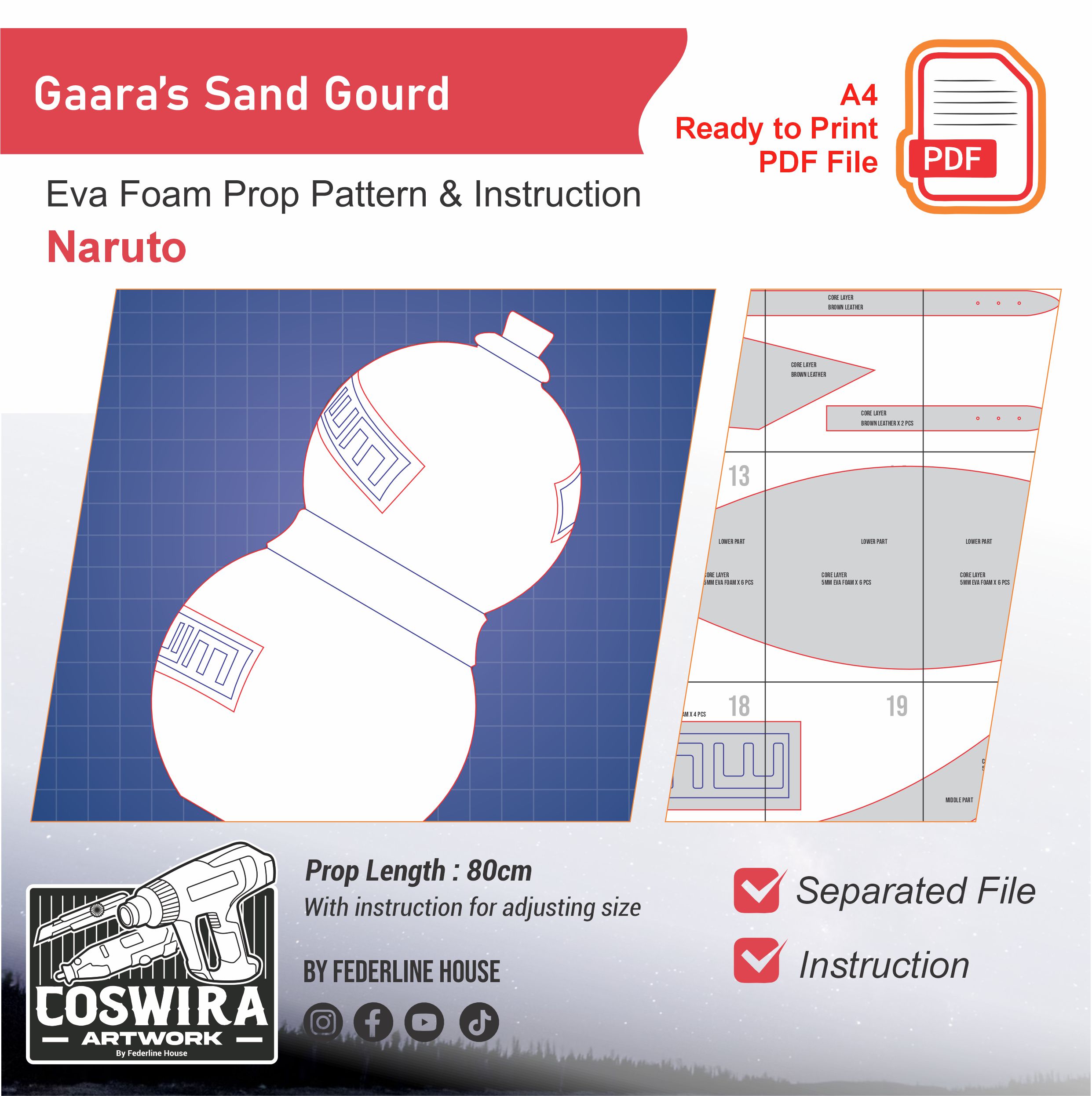 Buat gourd ikonik milik Gaara dari Naruto dengan EVA Foam pattern ini! Template ini dirancang supaya mudah dirakit tapi tetap mempertahankan bentuk khas dan detail dari wadah pasir milik Gaara. Ringan dan nyaman dibawa untuk cosplay event, photoshoot, atau display.