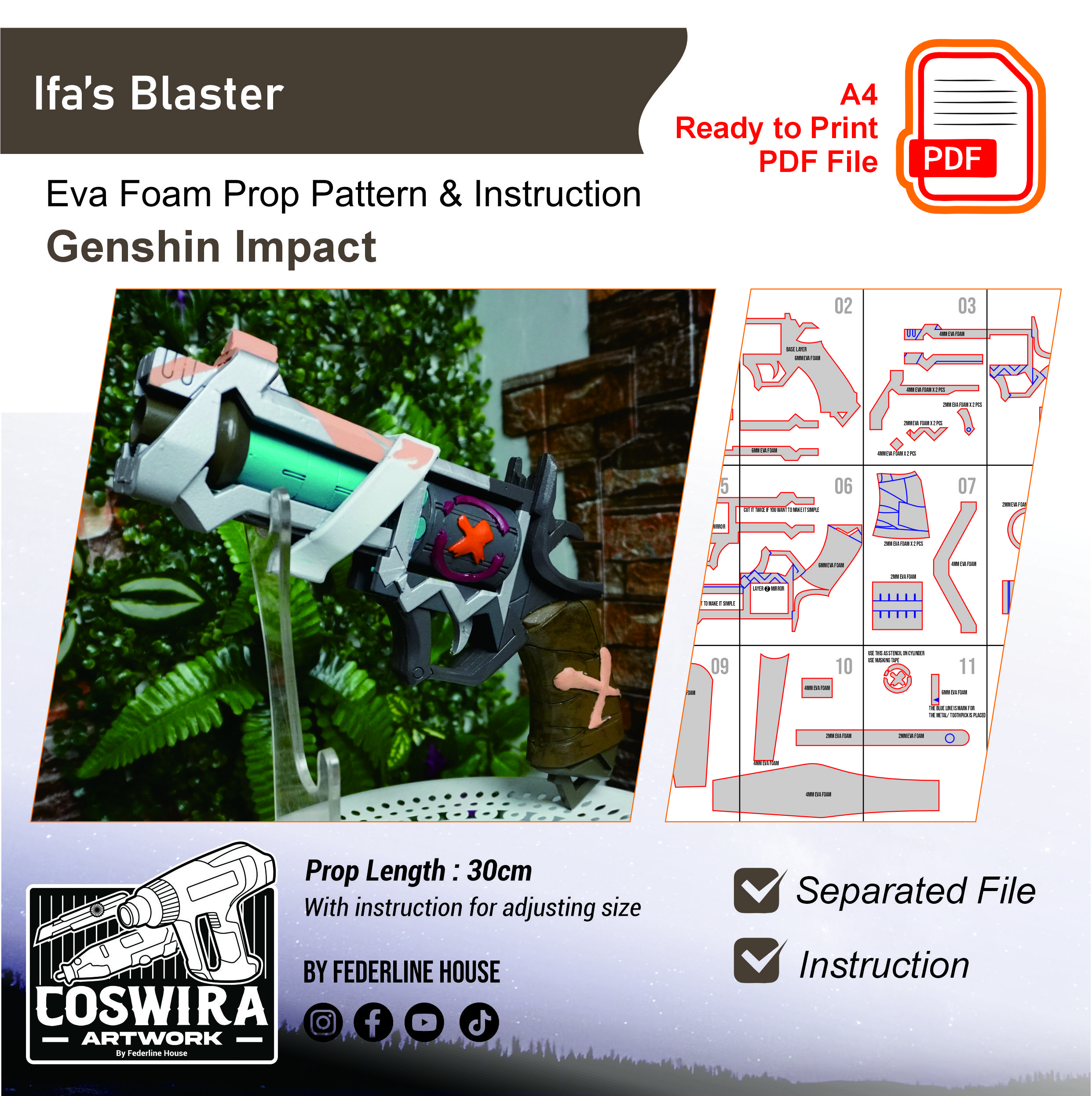 Buat gun milik Ifa dari Genshin Impact dengan EVA Foam pattern ini! Template ini dirancang supaya mudah dirakit tapi tetap terlihat detail, unik, dan akurat seperti versi karakter di game. Tetap ringan dan nyaman digunakan untuk cosplay event, photoshoot, atau display.