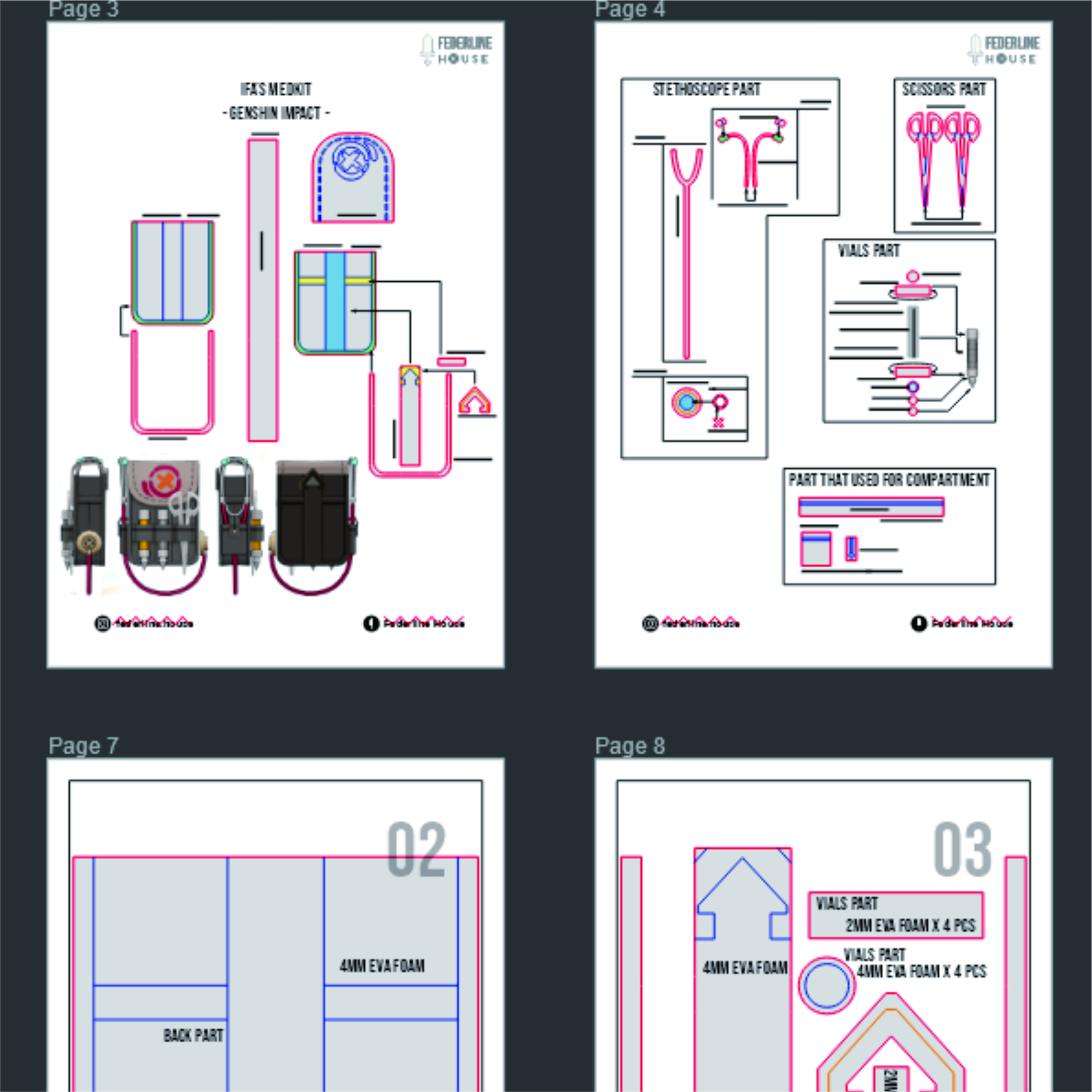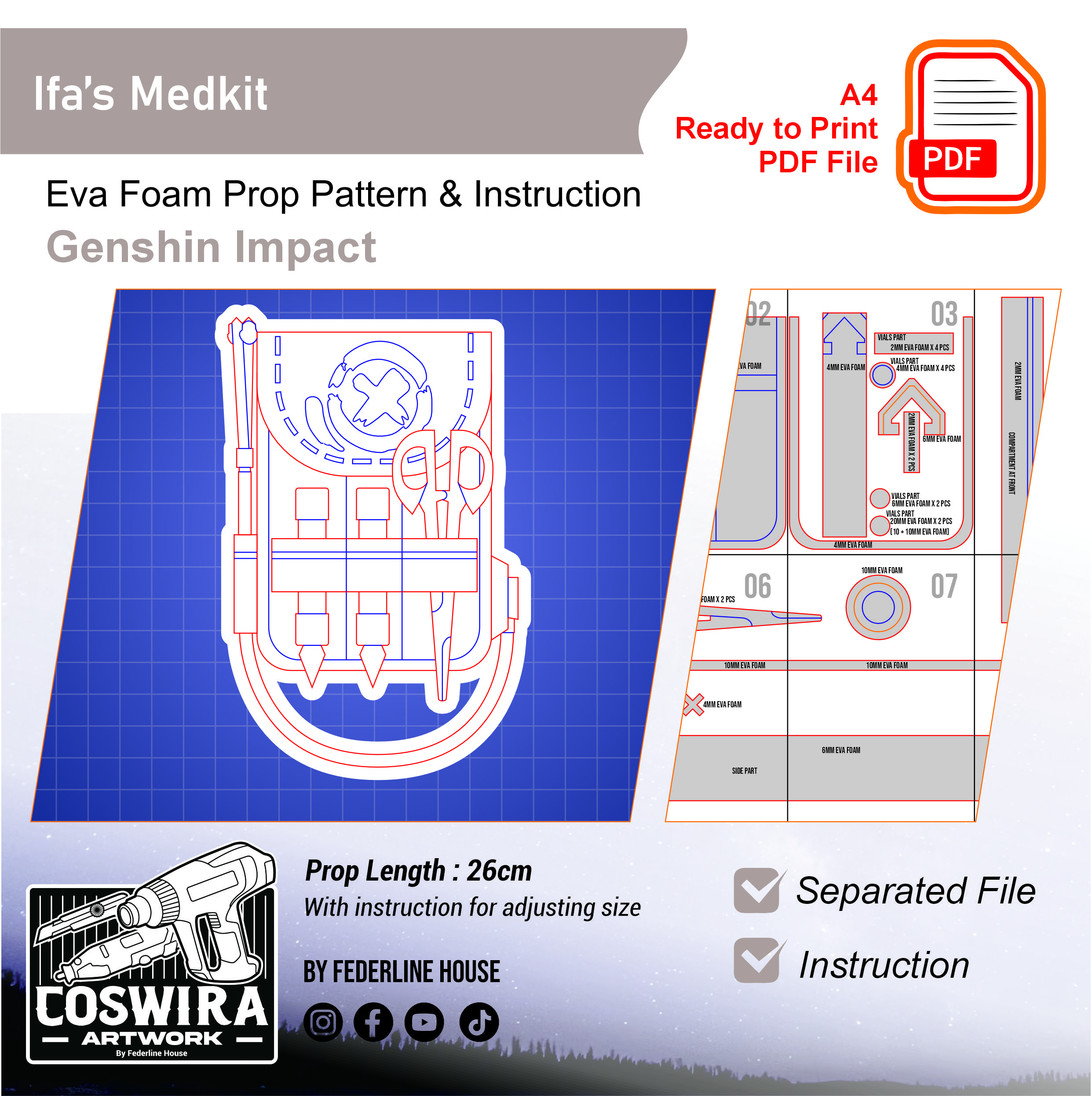 Buat medkit milik Ifa dari Genshin Impact dengan EVA Foam pattern ini! Template ini dirancang supaya mudah dirakit tapi tetap terlihat detail dan akurat seperti properti versi karakter. Tetap ringan dan nyaman digunakan untuk cosplay event, photoshoot, atau display.
