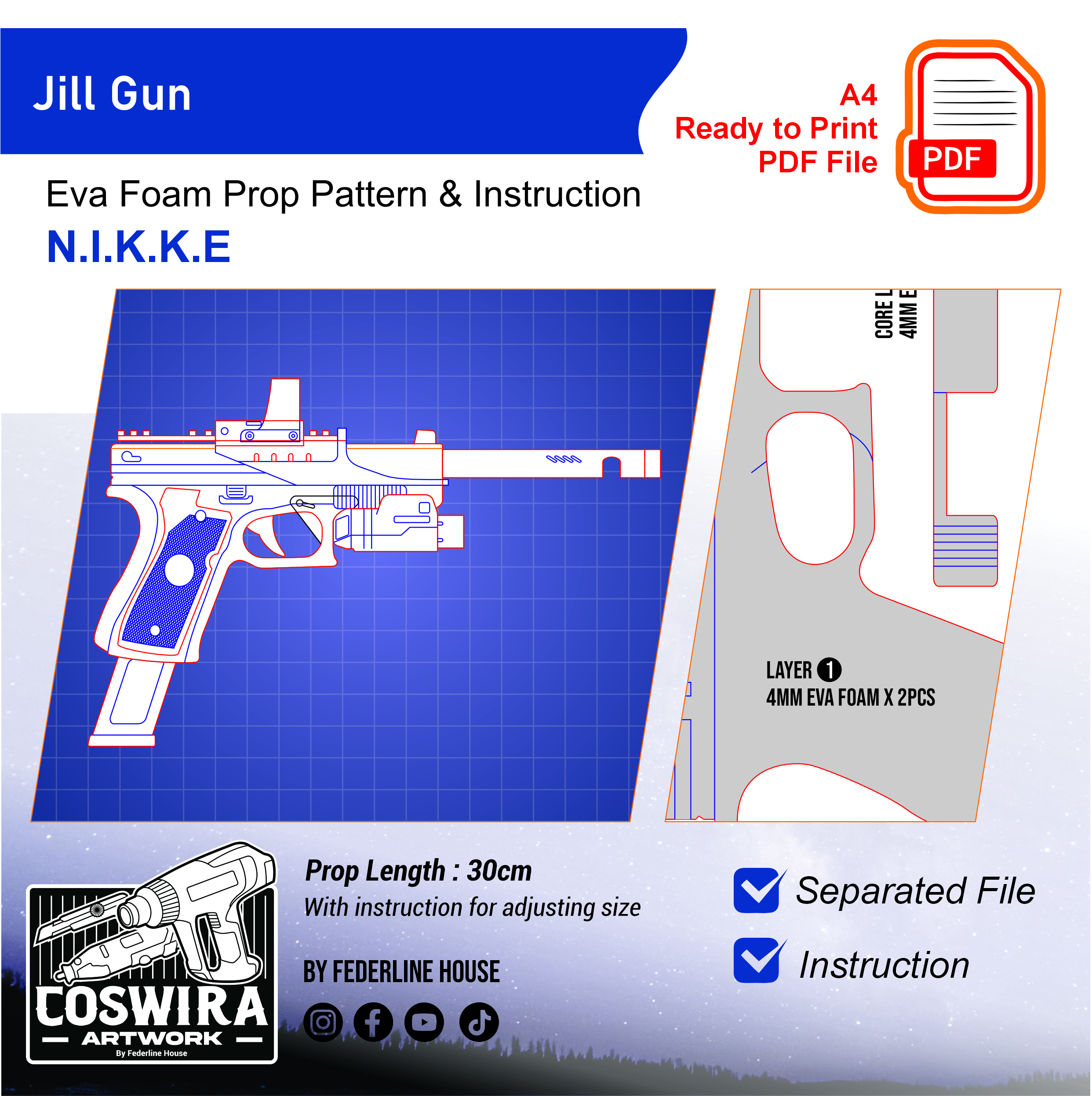 Buat pistol milik Jill dari Goddess of Victory: Nikke dengan EVA Foam pattern ini! Template ini dirancang supaya mudah dirakit tapi tetap mempertahankan bentuk futuristik dan detail khas senjata karakter. Ringan dan nyaman dibawa untuk cosplay event, photoshoot, atau display.