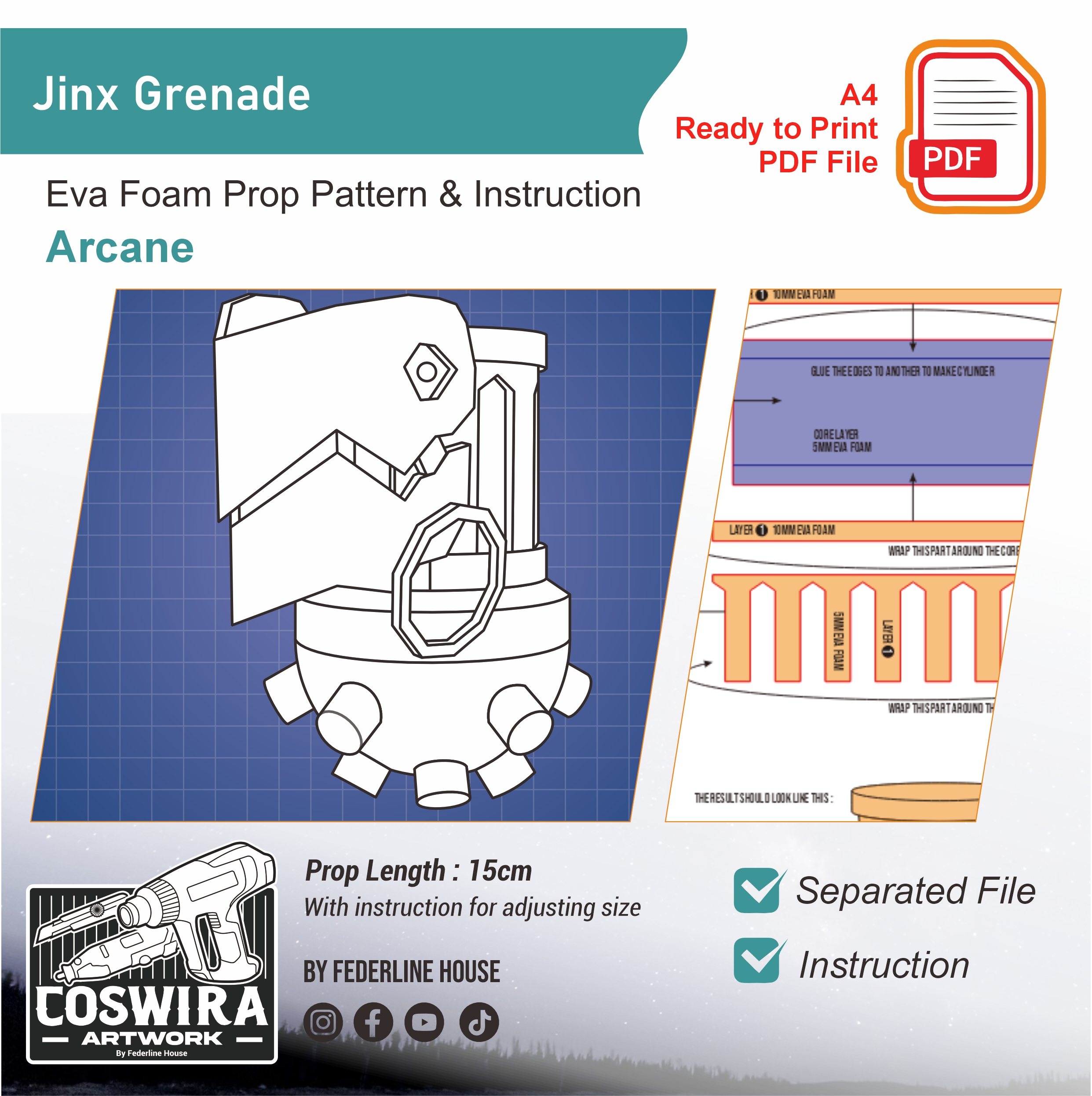 Bikin grenade ikonik milik Jinx dengan mudah pakai EVA Foam pattern ini! Desainnya dibuat supaya gampang dirakit tapi tetap mempertahankan bentuk prop khas karakter Jinx yang playful dan chaotic. Cocok untuk cosplay Arcane, photoshoot, event cosplay, atau display prop.