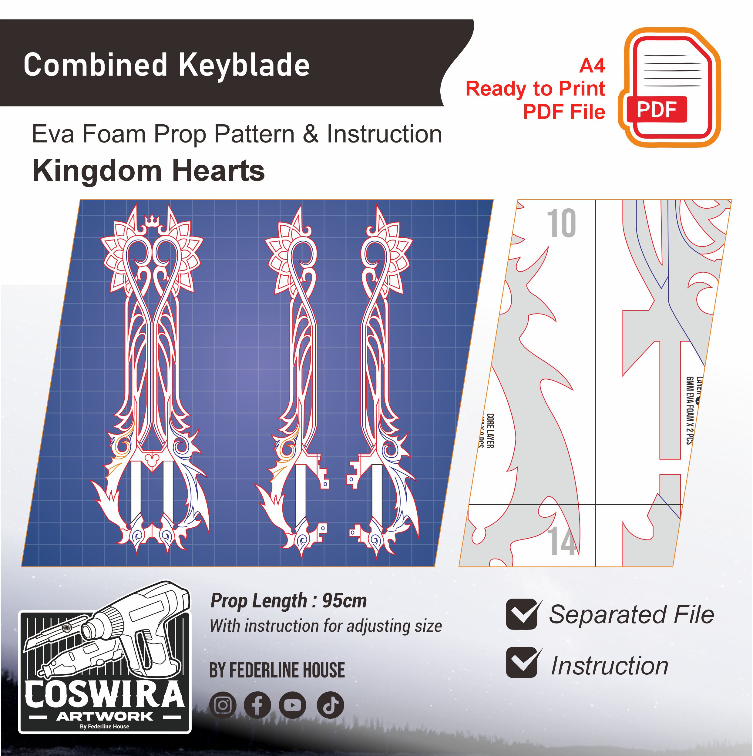 Buat Keyblade Combined dari Kingdom Hearts dengan EVA Foam pattern ini! Template ini dirancang supaya mudah dirakit tapi tetap terlihat ikonik, detail, dan akurat seperti versi senjata di game. Tetap ringan dan nyaman digunakan untuk cosplay event, photoshoot, atau display.