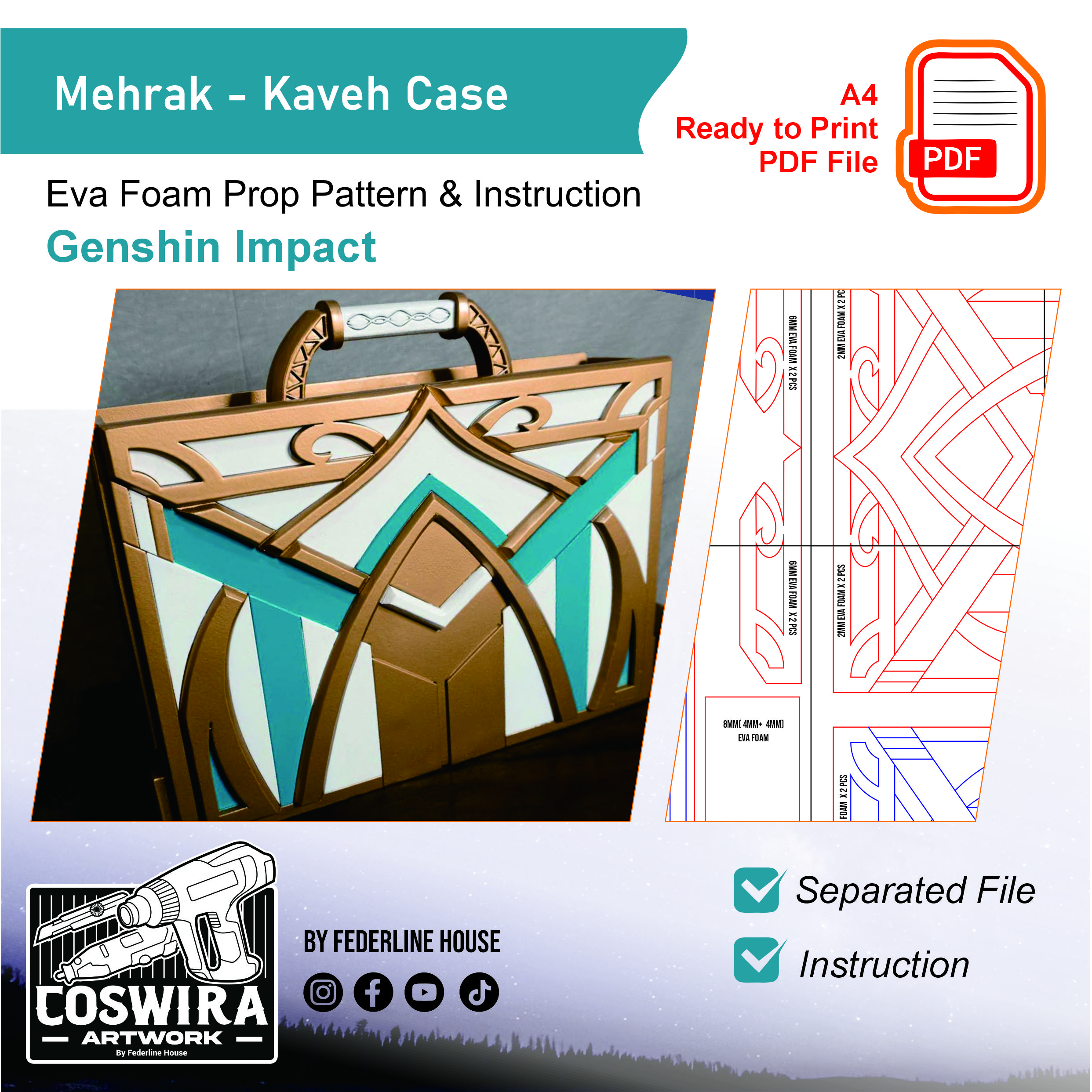 Buat Mehrak (koper milik Kaveh) dari Genshin Impact dengan EVA Foam pattern ini! Template ini dirancang supaya mudah dirakit tapi tetap terlihat unik, detail, dan akurat seperti properti versi karakter. Tetap ringan dan nyaman digunakan untuk cosplay event, photoshoot, atau display.