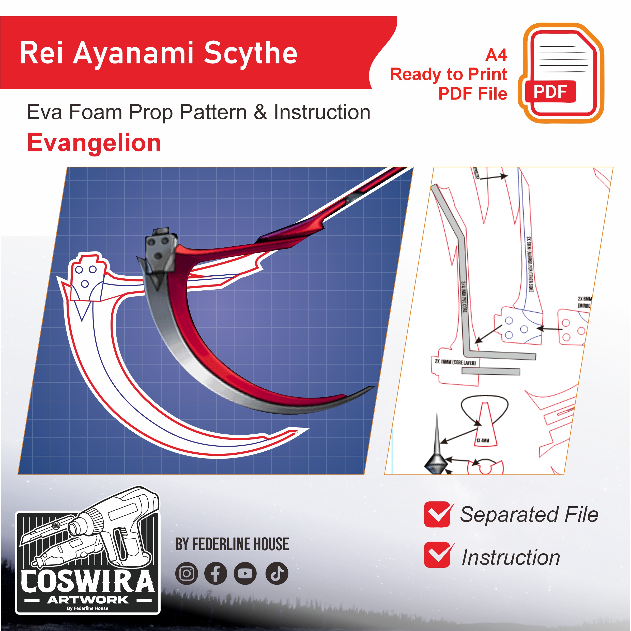 Buat scythe milik Rei Ayanami dari Evangelion dengan EVA Foam pattern ini! Template ini dirancang supaya mudah dirakit tapi tetap terlihat tajam, elegan, dan akurat seperti senjata versi karakter. Tetap ringan dan nyaman digunakan untuk cosplay event, photoshoot, atau display.
