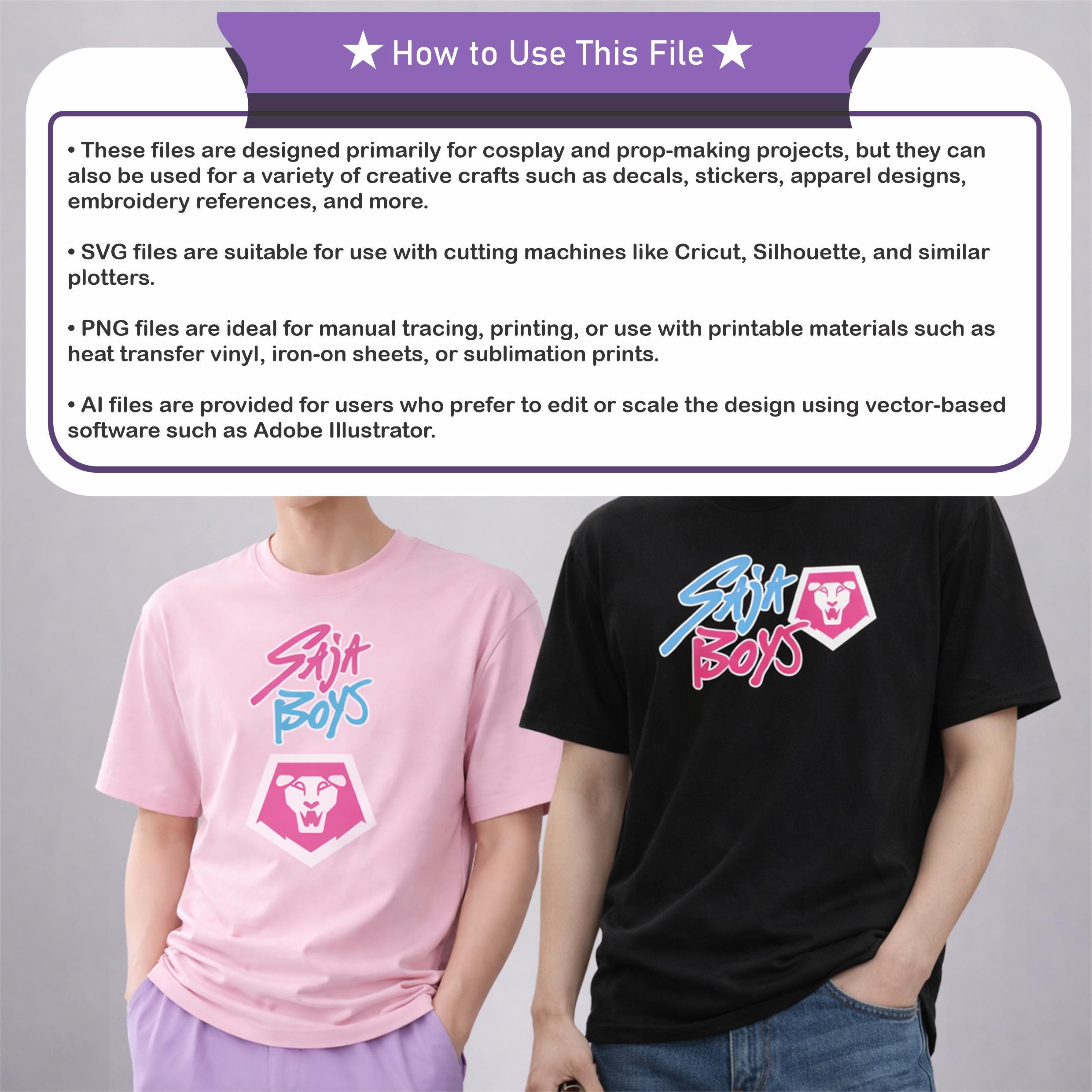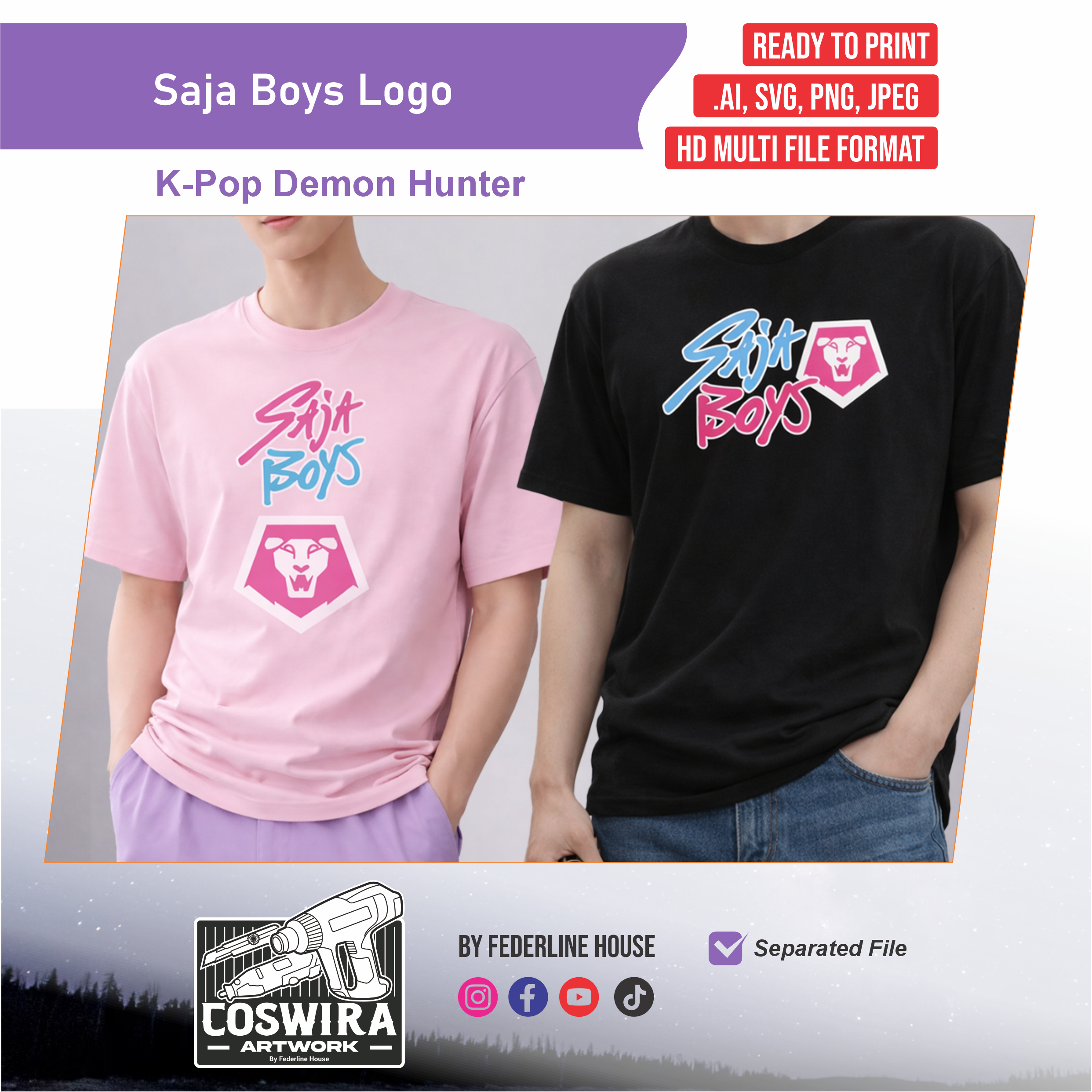 Hadirkan vibe bold dan penuh karakter dengan desain logo Saja Boys yang terinspirasi dari K-Pop Demons Hunter. File digital ini dirancang khusus untuk kebutuhan printing T-shirt dan apparel lainnya dengan tampilan clean, tajam, dan standout untuk fanwear maupun outfit bertema.