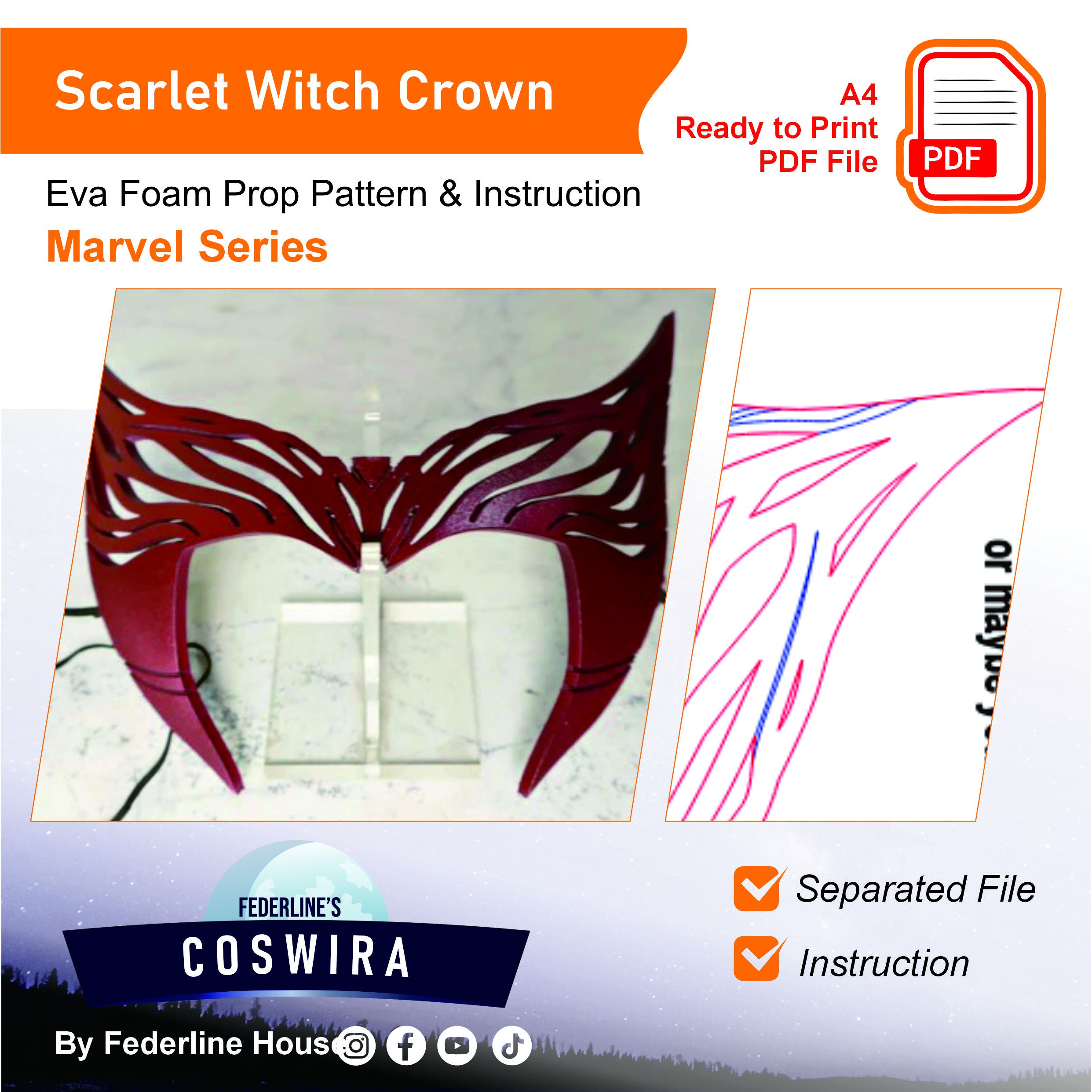 Buat crown ikonik milik Scarlet Witch dari Marvel dengan EVA Foam pattern ini! Template ini dirancang supaya mudah dirakit tapi tetap terlihat elegan, tajam, dan detail seperti versi karakter di film maupun komik. Cocok untuk cosplay event, photoshoot, atau display koleksi.