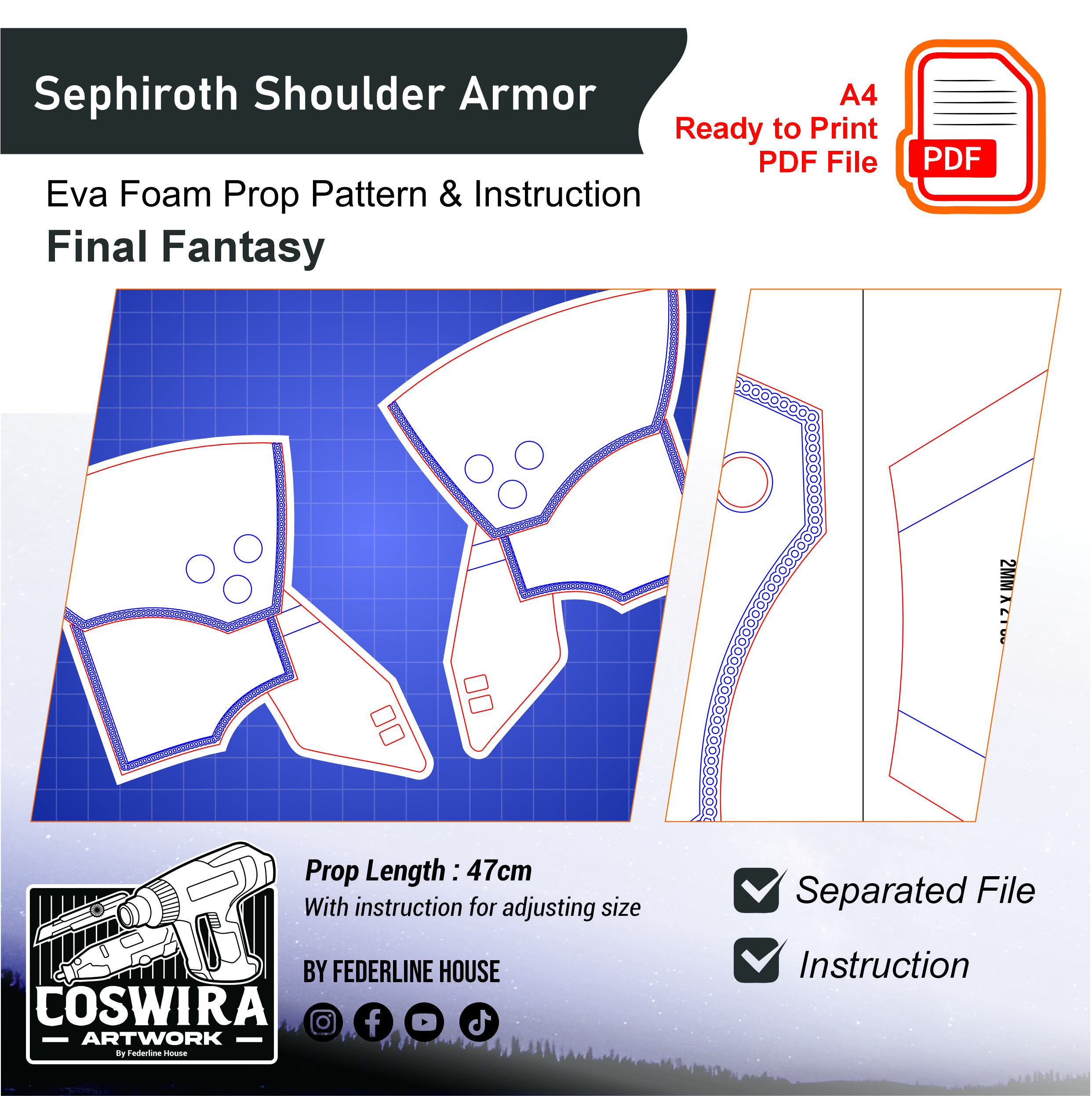 Buat shoulder armor milik Sephiroth dari Final Fantasy dengan EVA Foam pattern ini! Template ini dirancang supaya mudah dirakit tapi tetap terlihat tajam, elegan, dan detail seperti armor versi karakter. Tetap ringan dan nyaman digunakan untuk cosplay event, photoshoot, atau display.