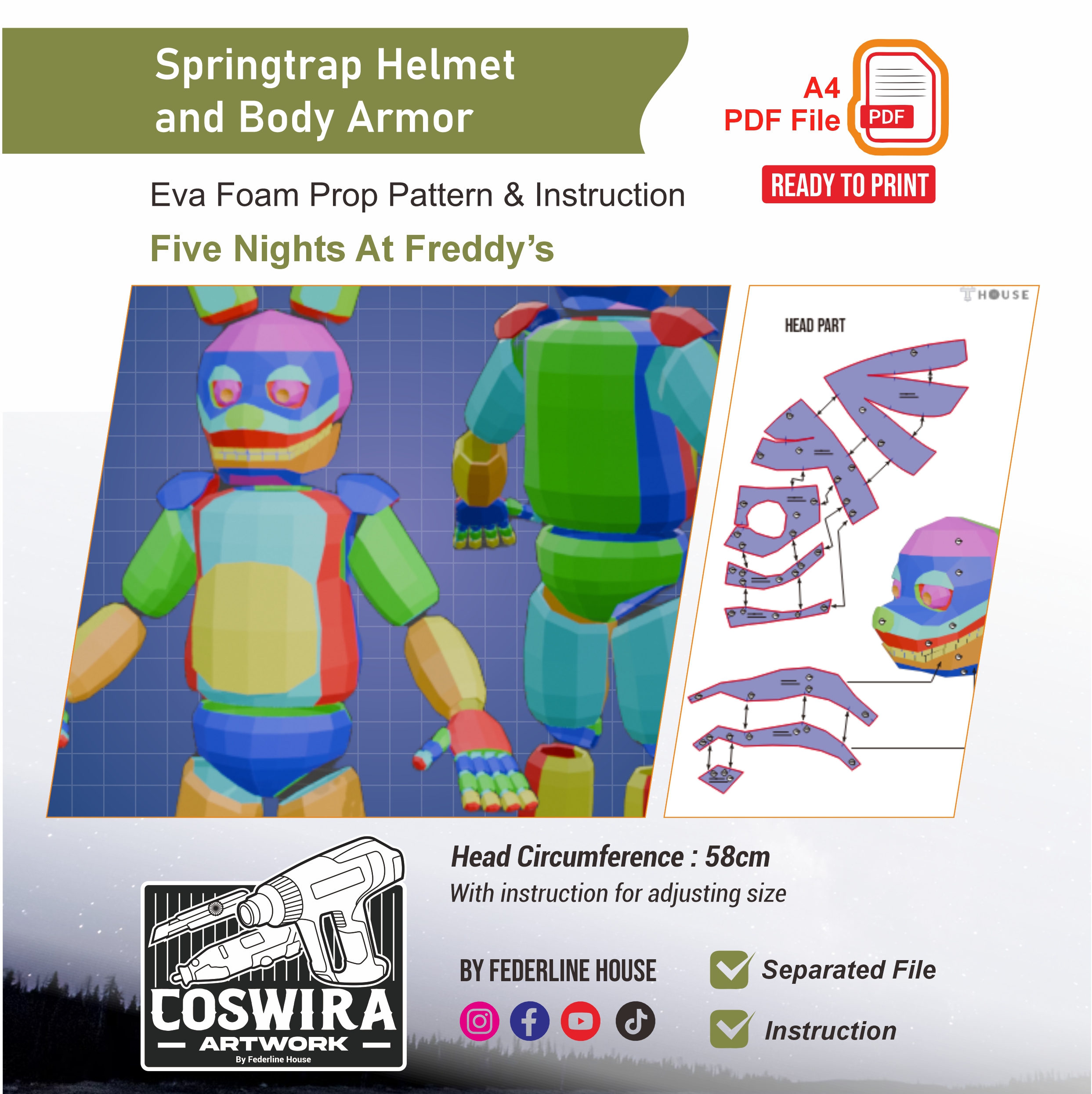 Buat set helmet dan body armor Springtrap dari Five Nights at Freddy’s dengan EVA Foam pattern ini! Template ini dirancang supaya mudah dirakit tapi tetap terlihat detail, solid, dan menyerupai design animatronic karakter. Tetap ringan dan nyaman digunakan untuk cosplay event, photoshoot, atau display.