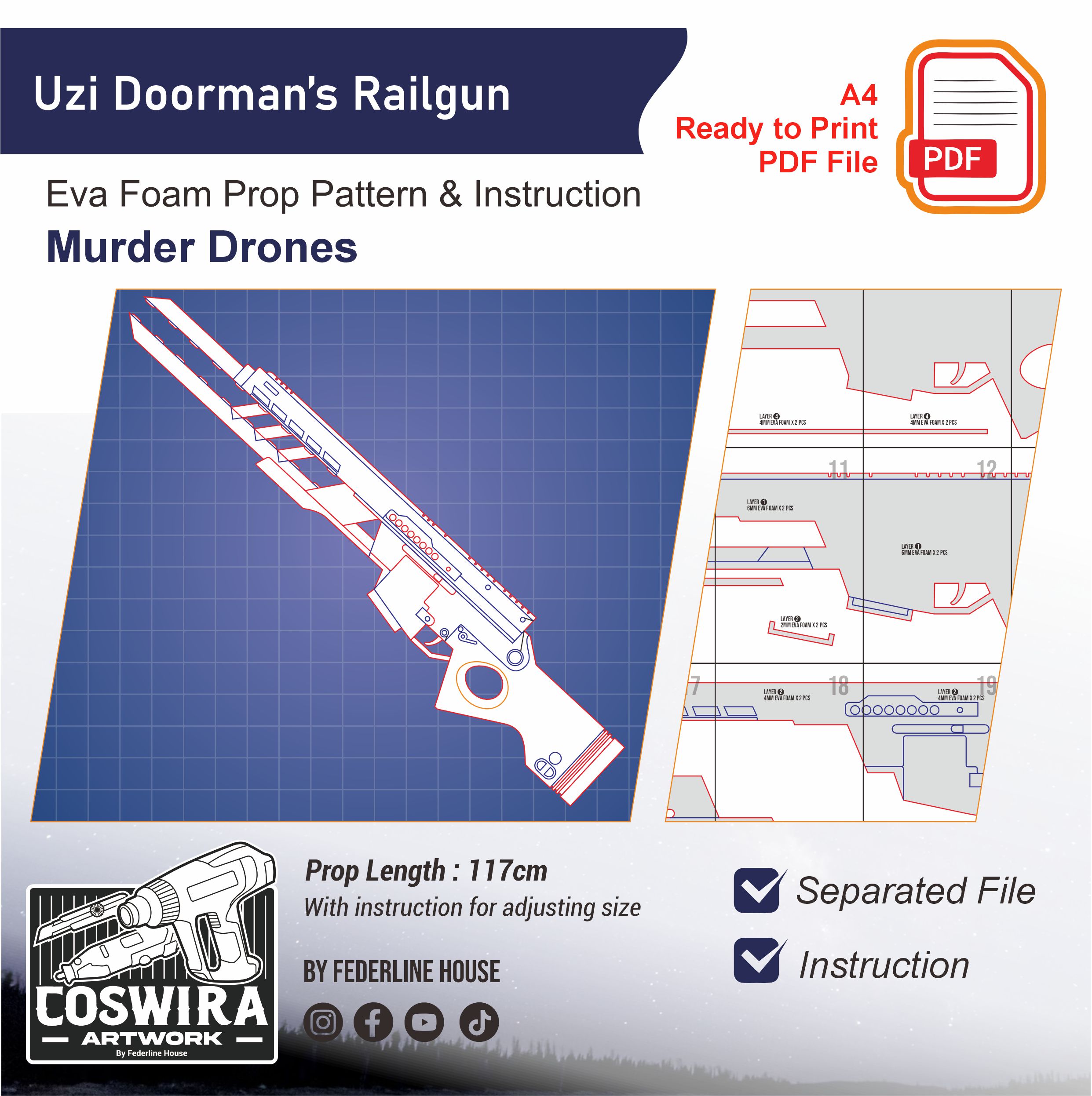 Buat railgun milik Uzi Doorman dari Murder Drones dengan EVA Foam pattern ini! Template ini dirancang supaya mudah dirakit tapi tetap mempertahankan bentuk futuristik dan detail khas senjata karakter. Ringan dan nyaman dibawa untuk cosplay event, photoshoot, atau display.