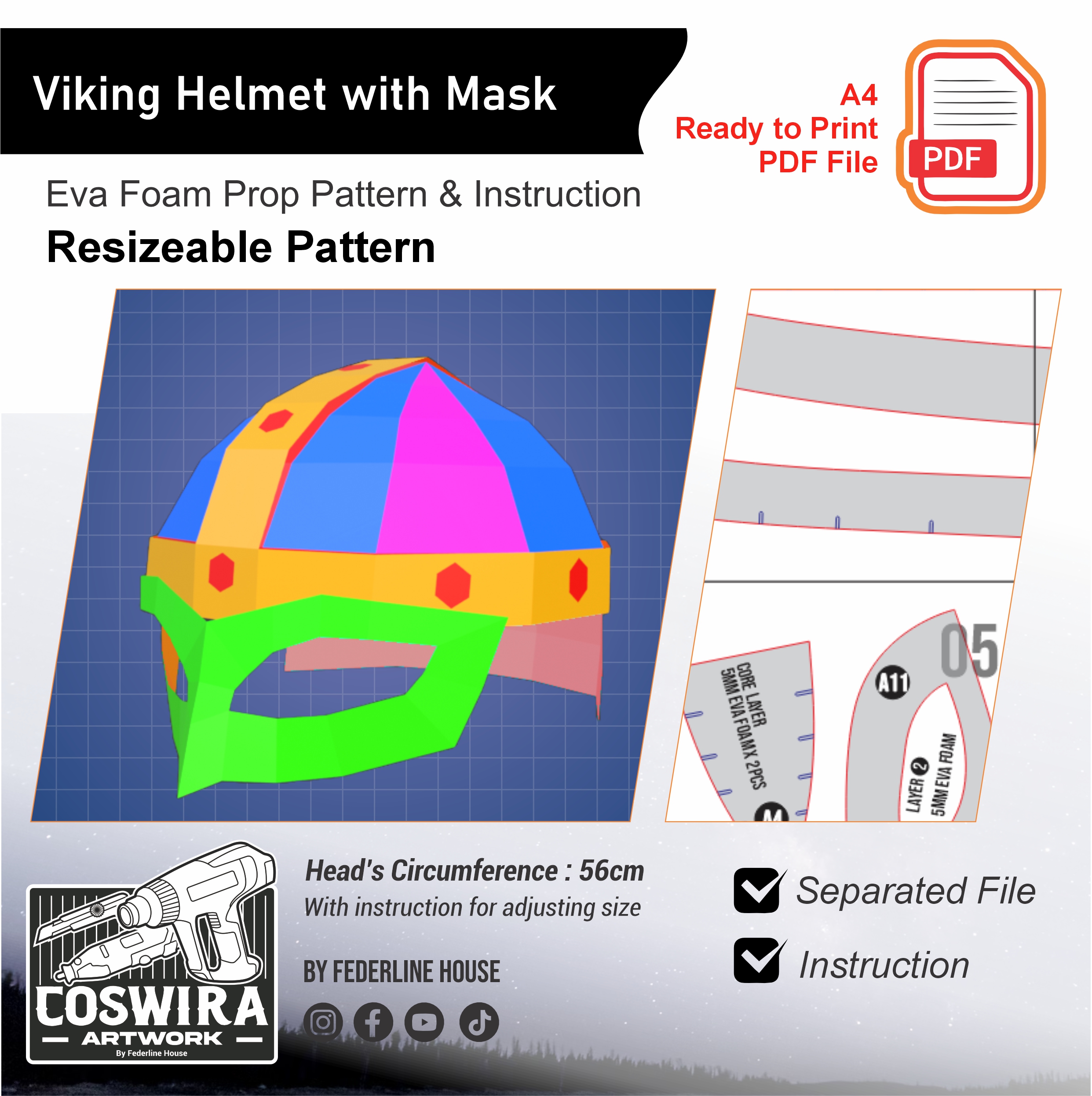 Bikin helm viking dengan mask dengan mudah pakai EVA Foam basic pattern ini! Desainnya dibuat simpel supaya gampang dirakit, tapi tetap menghasilkan bentuk helmet warrior yang solid dan mask yang kuat secara visual. Cocok untuk cosplay viking warrior, fantasy raider, stage costume, atau original character build.