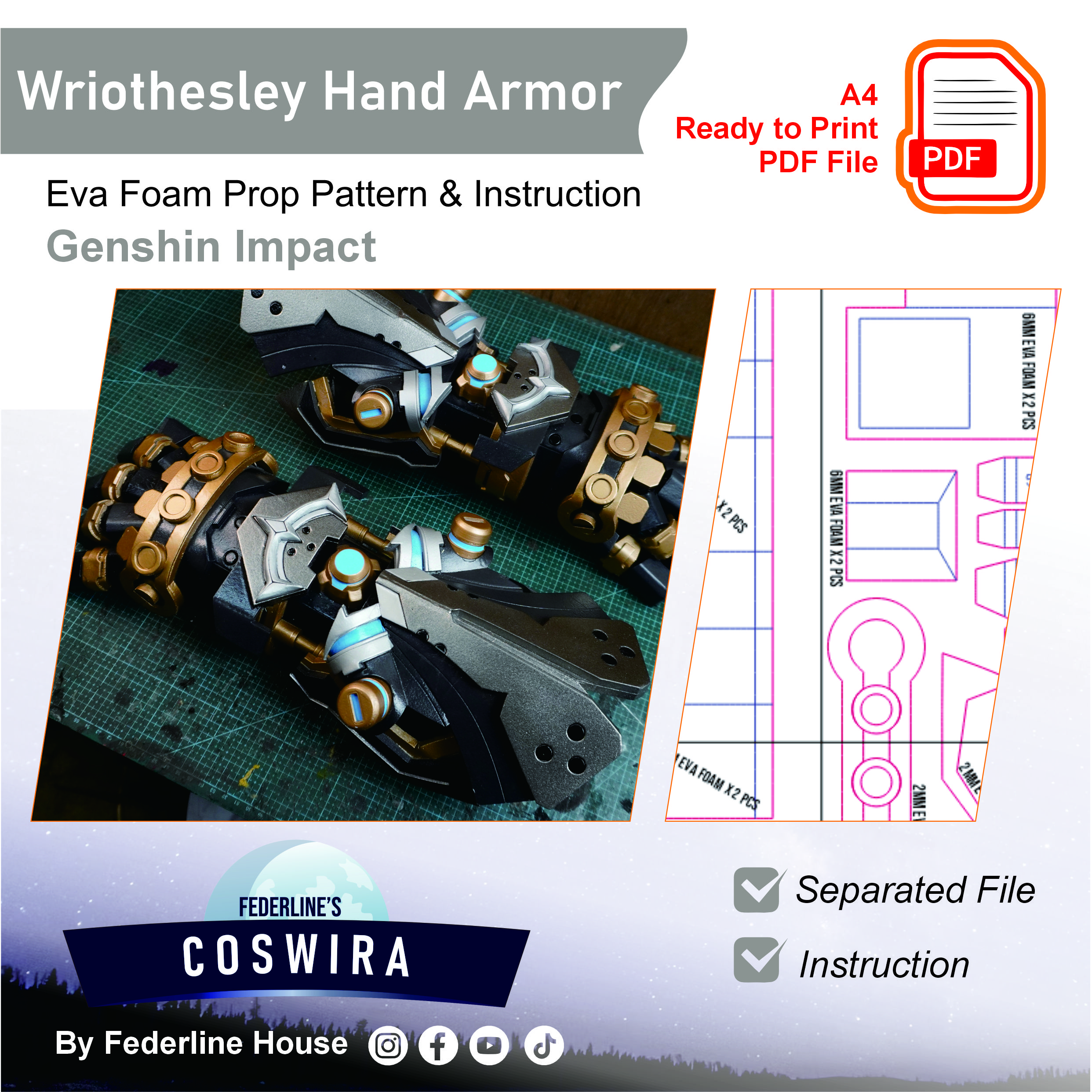 Buat hand armor milik Wriothesley dari Genshin Impact dengan EVA Foam pattern ini! Template ini dirancang supaya mudah dirakit tapi tetap terlihat detail, kokoh, dan akurat seperti armor versi karakter. Tetap ringan dan nyaman digunakan untuk cosplay event, photoshoot, atau display.